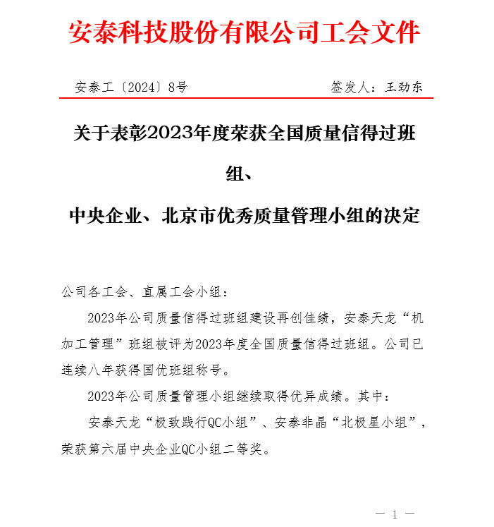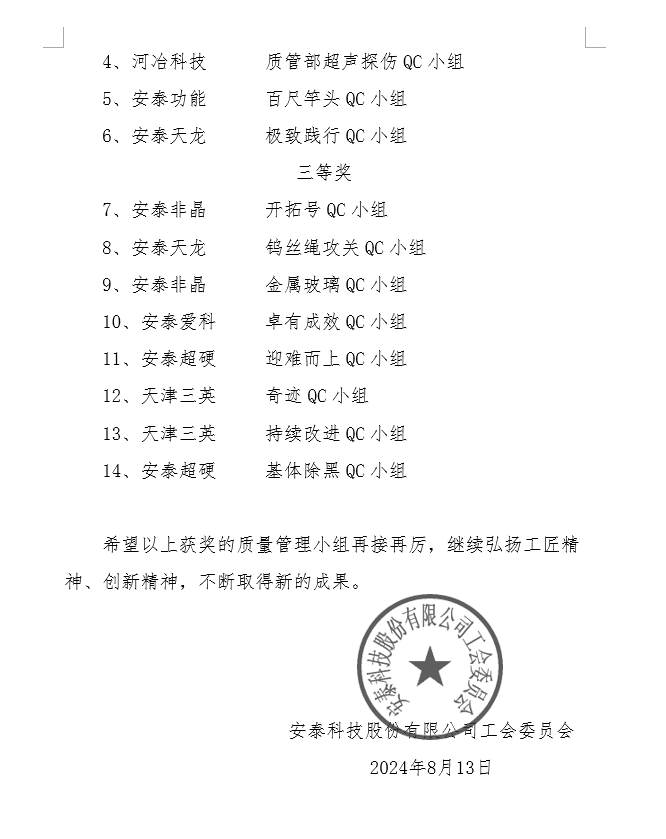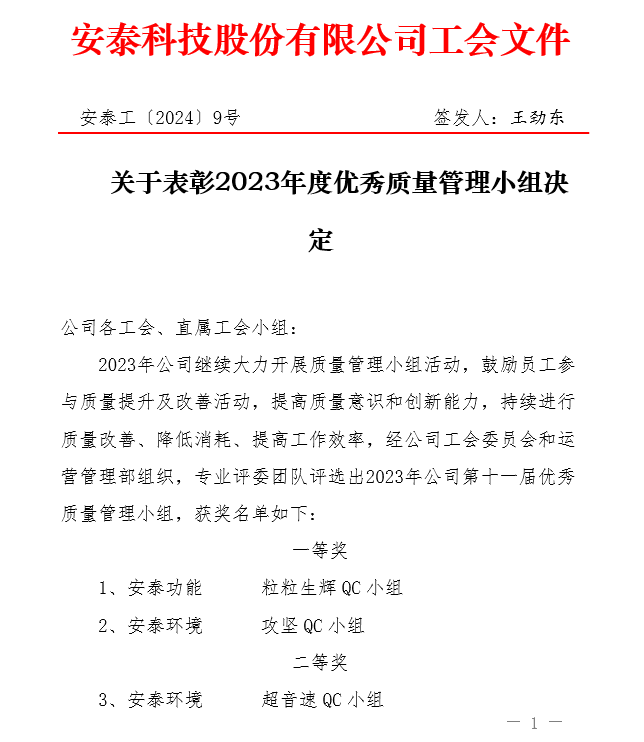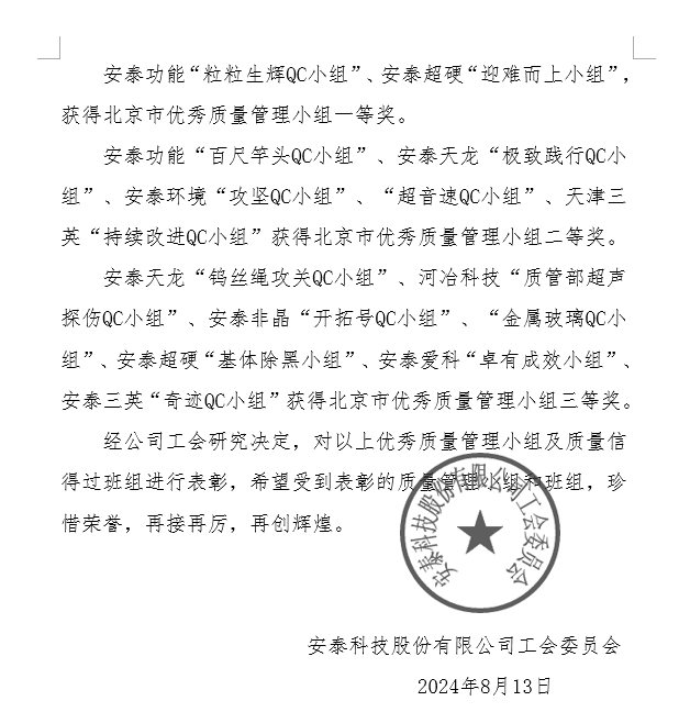 為鼓勵員工參與質(zhì)量提升及改善活動,提高質(zhì)量意識和創(chuàng)新能力,持續(xù)進行質(zhì)量改善、降低消耗、提高工作效率,河冶科技-質(zhì)管部超聲探傷QC小組榮獲中央企業(yè)、北京市優(yōu)秀質(zhì)量管理小組三等獎, 2023年安泰科技第十一屆優(yōu)秀質(zhì)量管理小組二等獎。